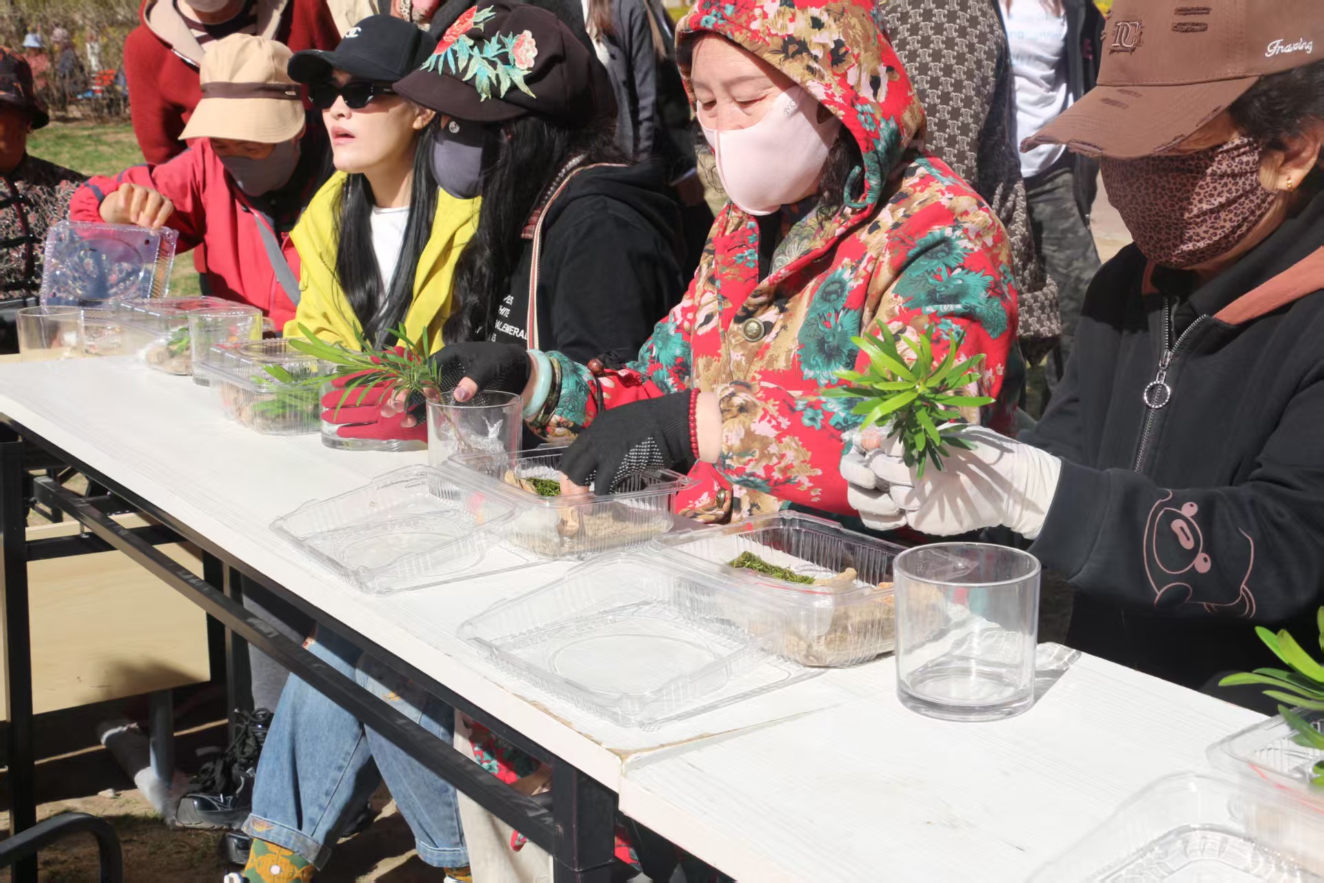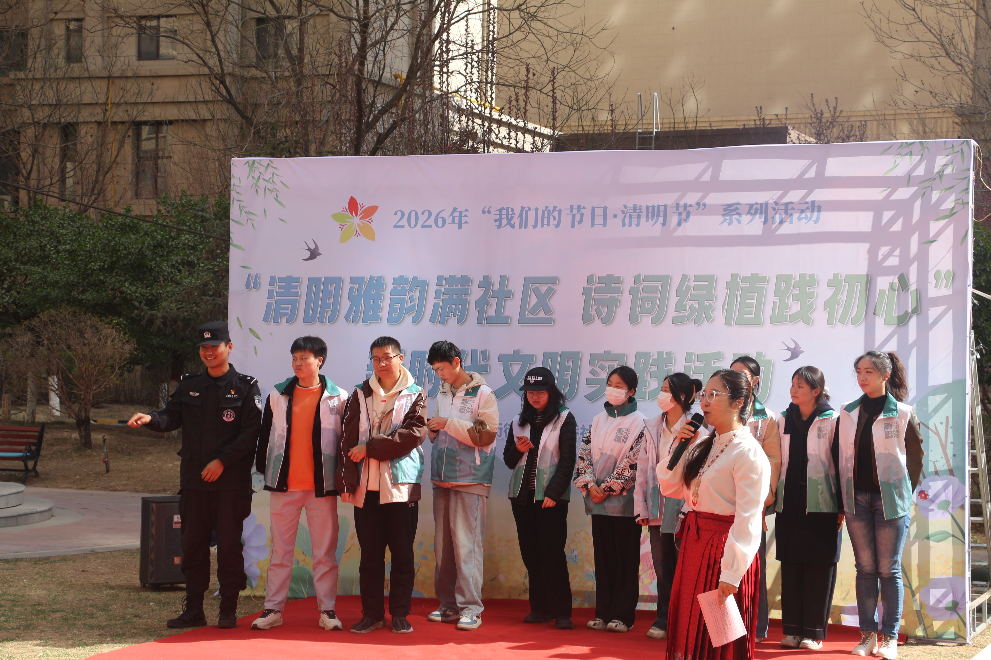 活动现场气氛庄重而热烈。社区特邀朗诵者深情诵读,缅怀为盛世中华献出生命的革命先烈,让英烈精神深入人心;社区工作人员与特警队员依次登台,以饱满的热情展现责任担当与昂扬风貌。我院师生也积极参与其中,用真挚的声音表达对先烈的追思与敬意,让红色基因在声声诵读中代代相传。随后,诗词飞花令将活动推向高潮,宁夏大学师生、我院学生代表与特警同台竞技,大家踊跃对答,在经典诗词中感受中华优秀传统文化的深厚底蕴。活动最后,大家共同参与盆栽栽种实践,亲手培土、栽苗、浇水,在沉浸式劳动中体悟耕耘之乐,厚植绿色环保理念。