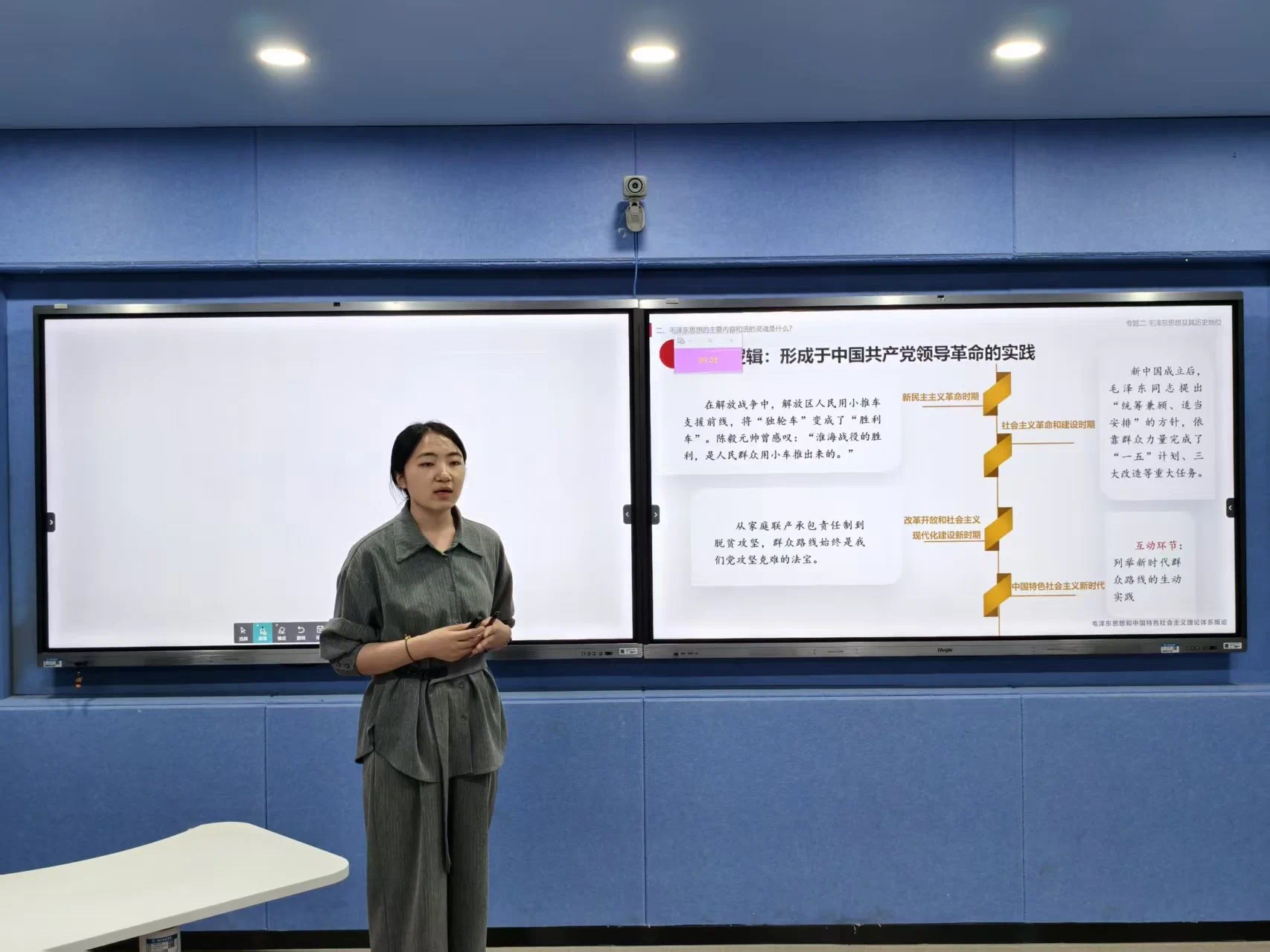 本次初赛依据教师报名情况,创新采用“三轨并行”模式,分别聚焦不同课程类别展开教学展示与深入交流。5 月 23 日上午 8 时,由习近平新时代中国特色社会主义思想概论教研室牵头在A8-211 教室迎来了第一组比赛,涵盖“习近平新时代中国特色社会主义思想概论”与“中国近现代史纲要”课程。参赛教师们凭借丰富多元的教学方法,巧妙引入生动鲜活的案例,将思政课堂的独特魅力展现得淋漓尽致,令现场氛围热烈非凡。