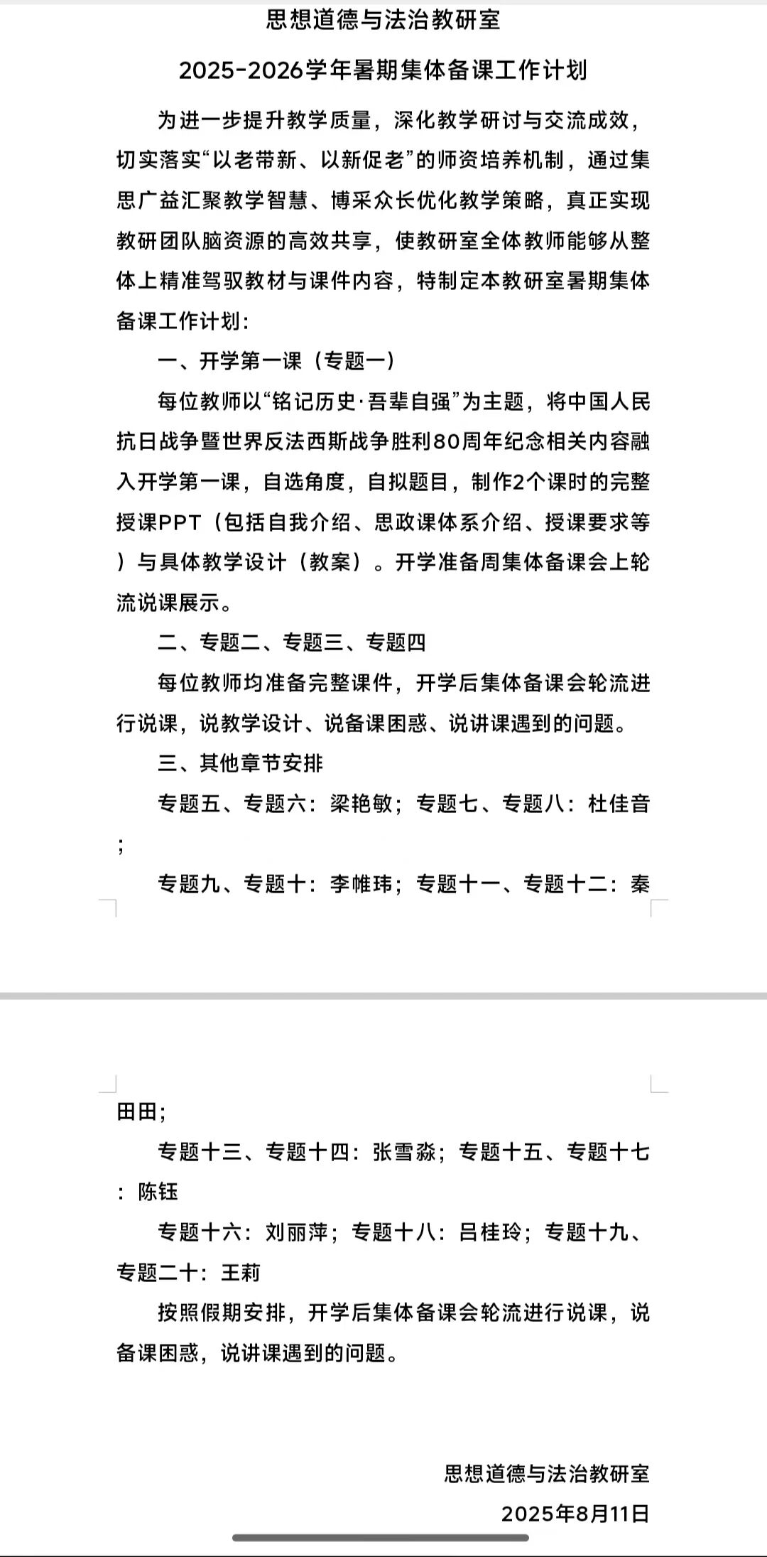 8 月 28 日,教研室在 A2-106 教室召开新学期工作部署会暨专题集体备课会,全体教师参会。本次备课会以 “铭记历史・吾辈自强” 为核心主题,围绕新学期 “开学第一课” 设计,组织全体教师逐一开展说课展示 —— 各位教师结合中国人民抗日战争暨世界反法西斯战争 80 周年纪念相关内容,详细阐述教学思路、内容设计与实施路径;展示结束后,教师们围绕说课内容展开深度点评与交流,分享备课心得与授课经验,在高效互动的氛围中凝聚教学共识,为打造高质量“开学第一课” 奠定坚实基础。