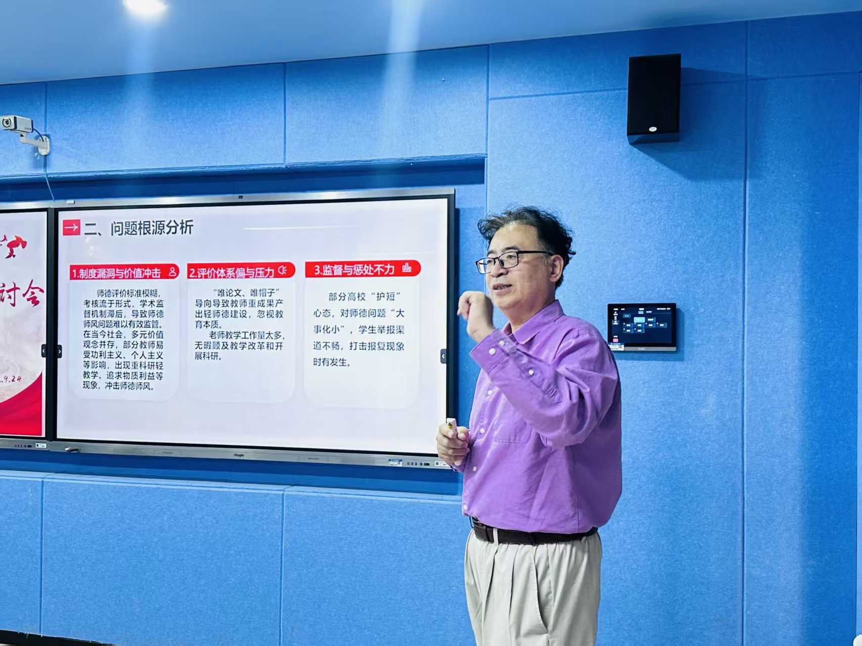 宋海涛处长围绕新时代高校教师的使命与担当,从师德师风的内涵意义、建设依据、存在问题、践行要求、考核机制及教师修养自我提升六个维度,系统阐述了新时代高校教师师德师风建设的核心要义。通过解读习近平总书记关于师德师风的系列重要指示以及《新时代高校教师职业行为十项准则》等国家政策文件,为教师践行师德师风提供了根本遵循。针对当前师德师风存在的学术不端、师生关系异化、政治方向偏差等问题,宋海涛处长结合典型案例与数据进行深入剖析,并从制度漏洞、评价体系偏差、监督惩处不力等方面分析根源,引导教师引以为戒。同时围绕师德师风考核机制与教师修养自我提升,宋海涛处长提出通过“一票否决制”“师德标兵”表彰等强化考核激励,建议教师从转变教育观念、重构教学内容、掌握数智技术、优化课堂管理等方面发力,尤其针对思政课教师,强调需在政治、情怀、思维、视野、自律、人格六方面锤炼自我。