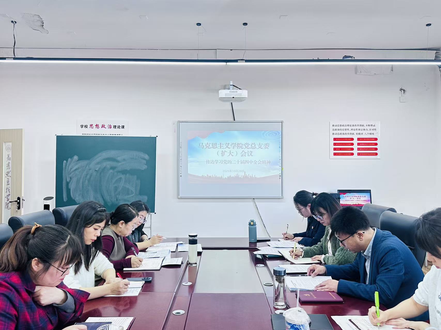 为深入学习贯彻党的二十届四中全会精神,切实把全院教师的思想和行动统一到全会精神上来,10月28日下午,马克思主义学院党总支委(扩大)会议在A1-504召开。学院党总支书记、副书记、各党支部书记,党总支及各党支部支委成员,各教研室主任,办公室负责人参加会议,专题传达学习党的二十届四中全会精神,对学院学习宣传贯彻工作作出全面部署。