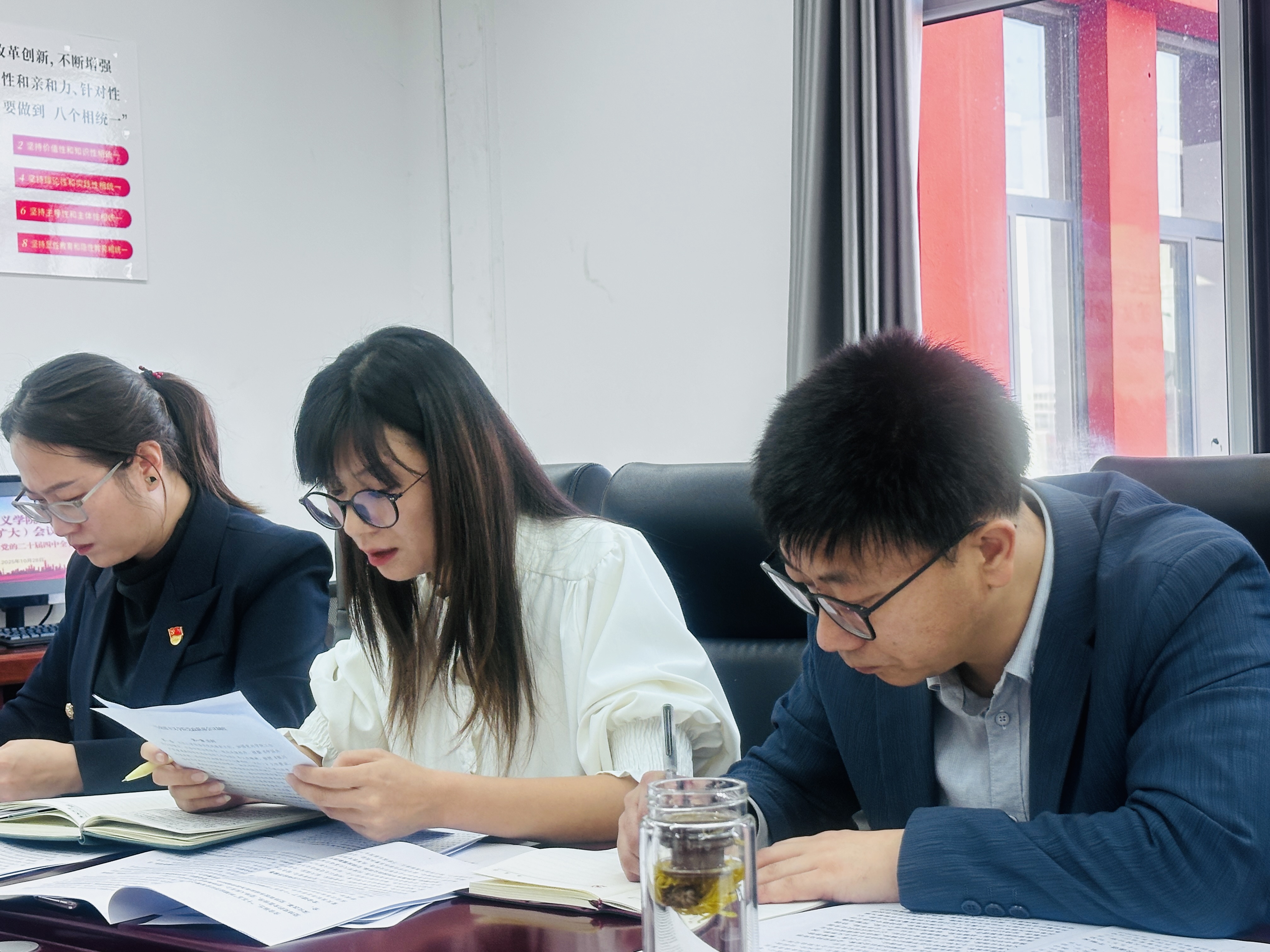 在理论武装维度,要求各党支部以“三会一课”为载体,开展形式多样的学习活动,深化对党的二十届四中全会精神的理解与把握,确保理论学习锚定政治方向、紧扣精神实质、贴合学科实际,不跑偏、不走样。在教学融入维度,落实教工委部署要求,各教研室要把党的二十届四中全会精神有机融入思政课教学体系,通过集体备课、专题讲授、案例分析、实践教学等多种方式,引导学生深刻理解二十届四中全会精神的核心要义和实践要求,增强对中国特色社会主义制度的政治认同、思想认同、理论认同和情感认同。在研究阐释维度,鼓励学院教师发挥学科优势,围绕二十届四中全会提出的重大理论和实践问题,开展多学科交叉研究,为推动全会精神的学理化阐释、学术化表达、大众化传播贡献马院智慧。