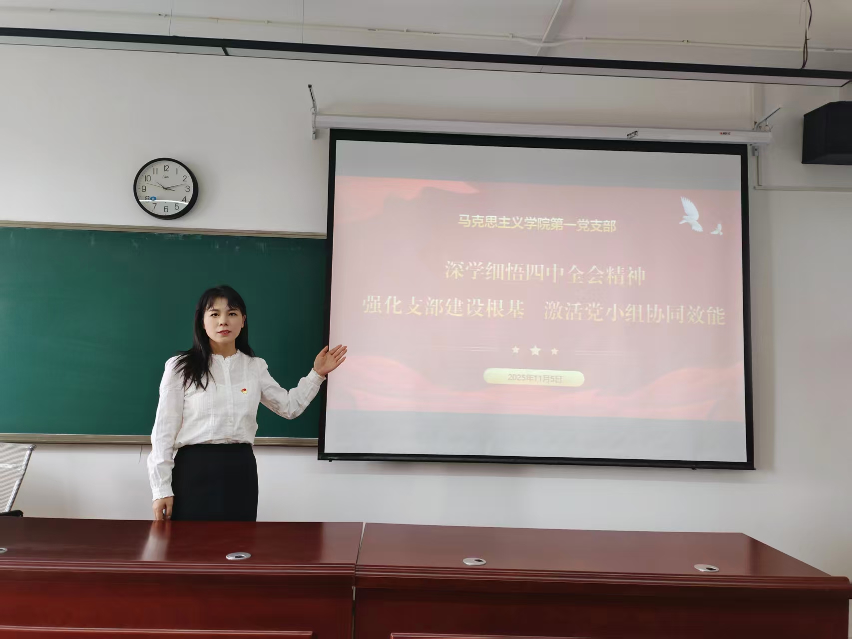 为深入贯彻落实党的二十大精神与党的二十届四中全会精神,扎实推进党支部标准化规范化建设,进一步激发支部活力、凝聚党员力量,2025年11月5日14:00,马克思主义学院第一党支部在A1-505教室召开专题党员大会。“深学细悟四中全会精神强化支部建设根基激活党小组协同效能”为题讲授党课,全体党员参加会议。党课上,支部书记郝晓兰围绕党的二十大报告中“增强党组织政治功能和组织功能”的重要论述,结合二十届四中全会提出的“以全面从严治党为根本保障”“推动基层党组织全面进步全面过硬”等核心要求,系统阐释了支部建设的核心要义与实践路径。郝晓兰书记强调,党的二十届四中全会为“十五五”时期党的建设指明了方向,党支部作为党的肌体“神经末梢”,是贯彻落实党中央决策部署的“最后一公里”,必须把学习贯彻全会精神作为当前和今后一个时期的重大政治任务;而特色党小组则是支部发挥战斗堡垒作用的重要支撑,支部构建“支部统一主体,三个小组协同发力”的“一体三翼”工作格局,正是践行全会精神、推动党建与业务深度融合、破解发展难题的关键举措,全体党员要立足党小组职能定位,在各自岗位上担当作为,把全会要求落到实处。