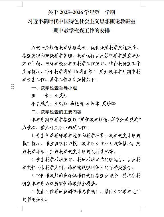 为进一步规范教学管理流程、提升教学质量,及时定期检查发现并解决教学管理、教学运行以及影响教学质量的因素等多方面问题,根据银川科技学院及马克思主义学院教学工作安排,结合实际工作情况,习近平新时代中国特色社会主义思想概论教研室(以下简称教研室)于11月5日上午8:30 在A1-504召开了2025-2026学年第一学期期中教学检查动员部署会。