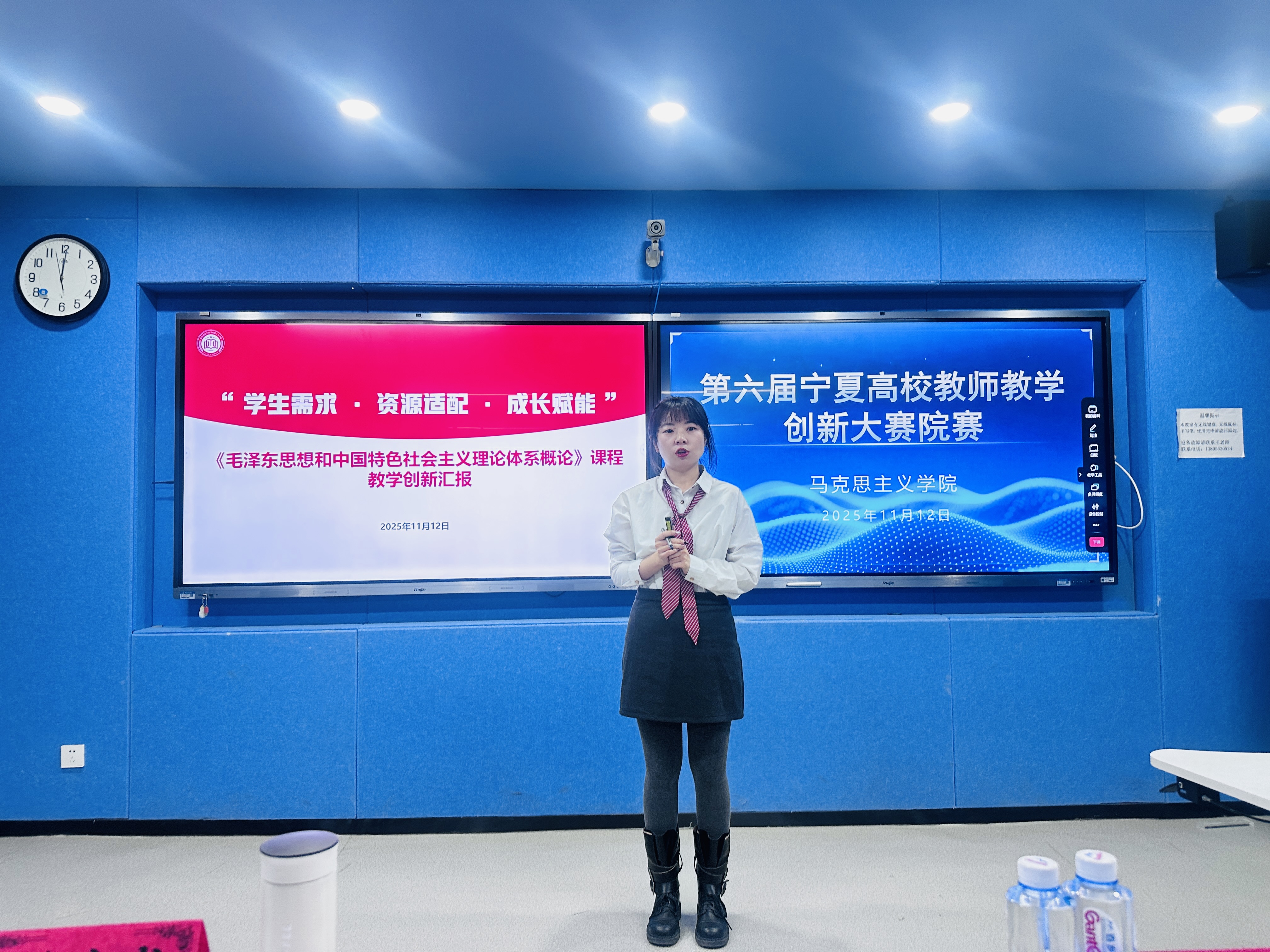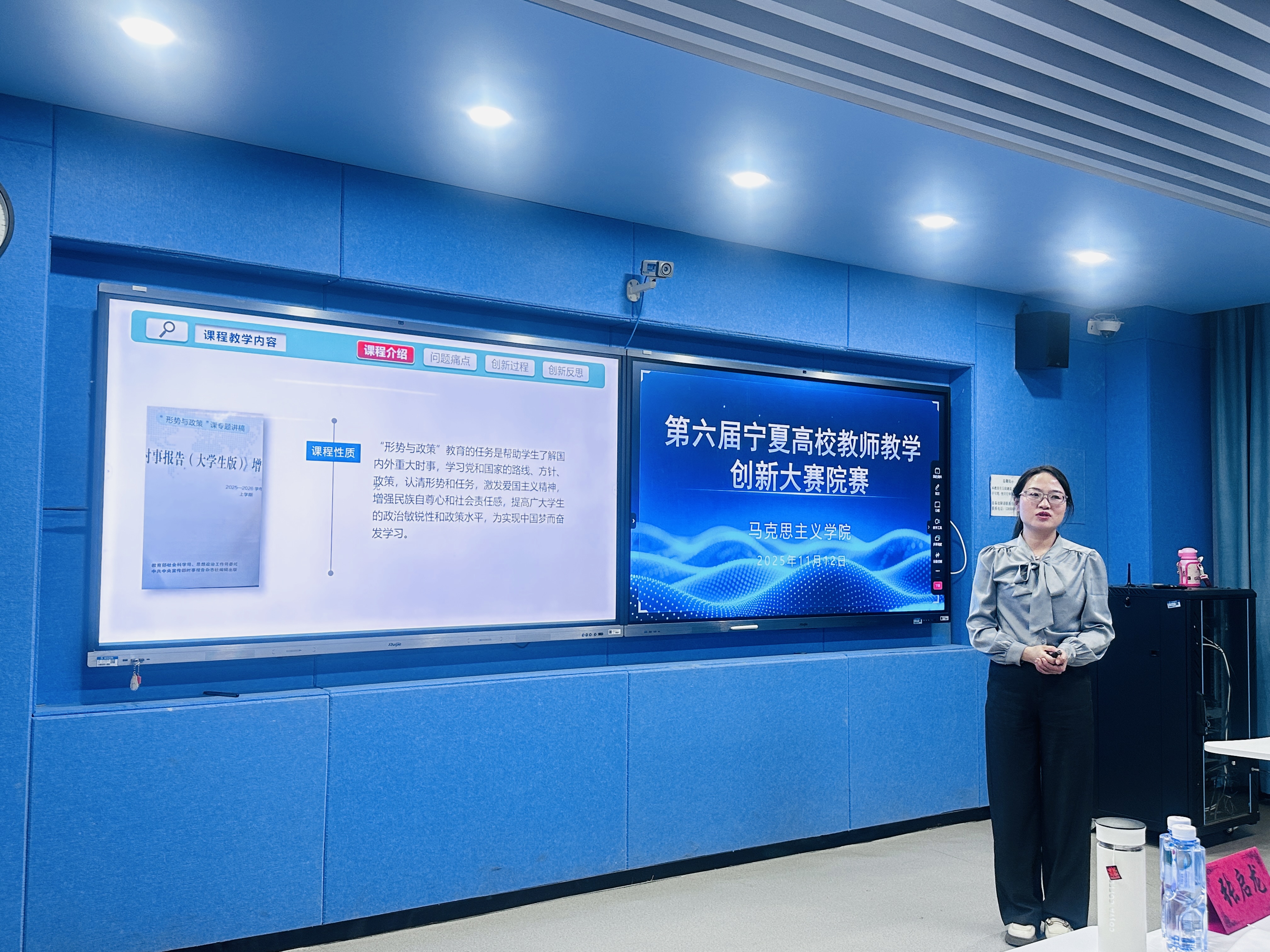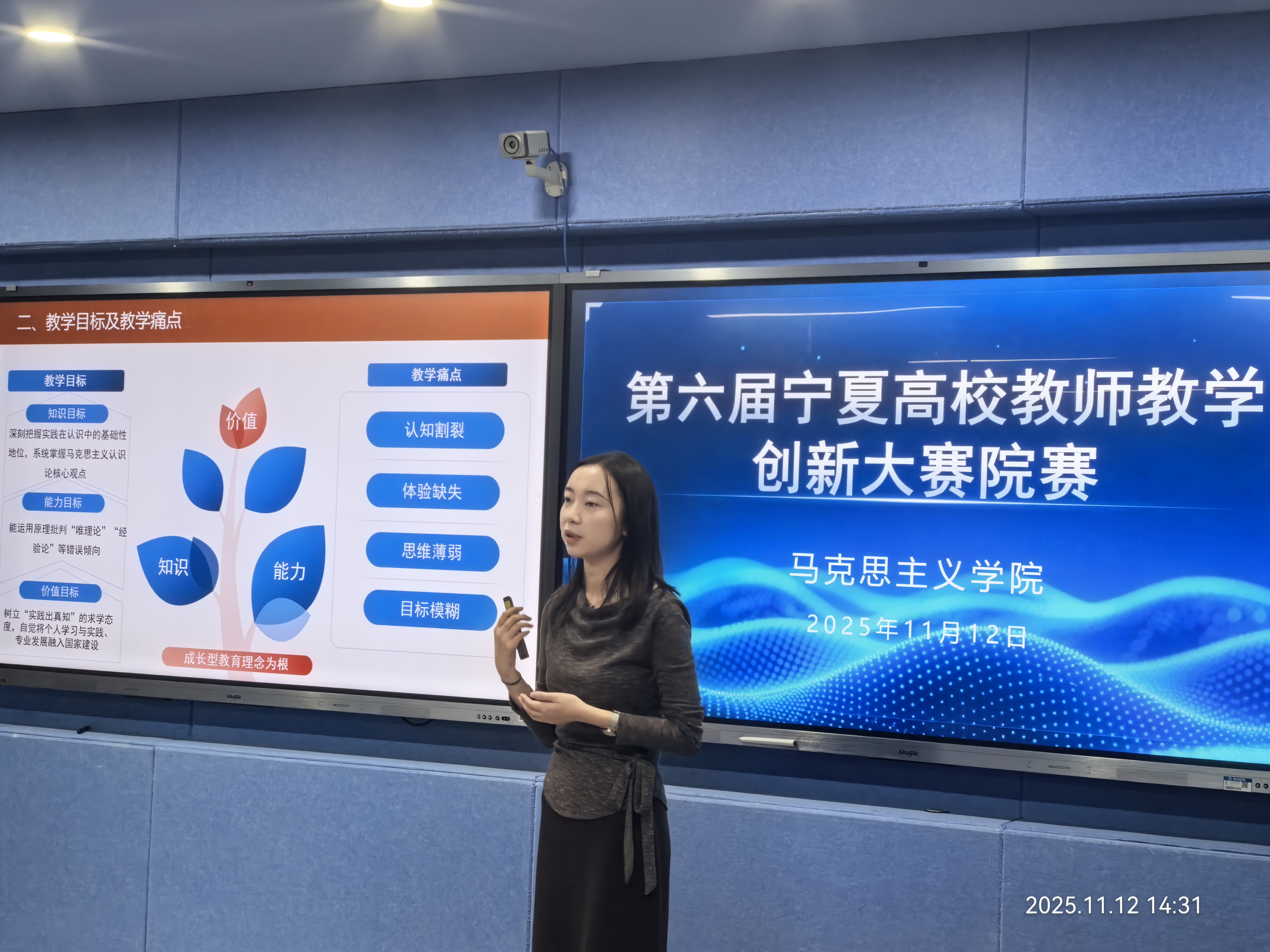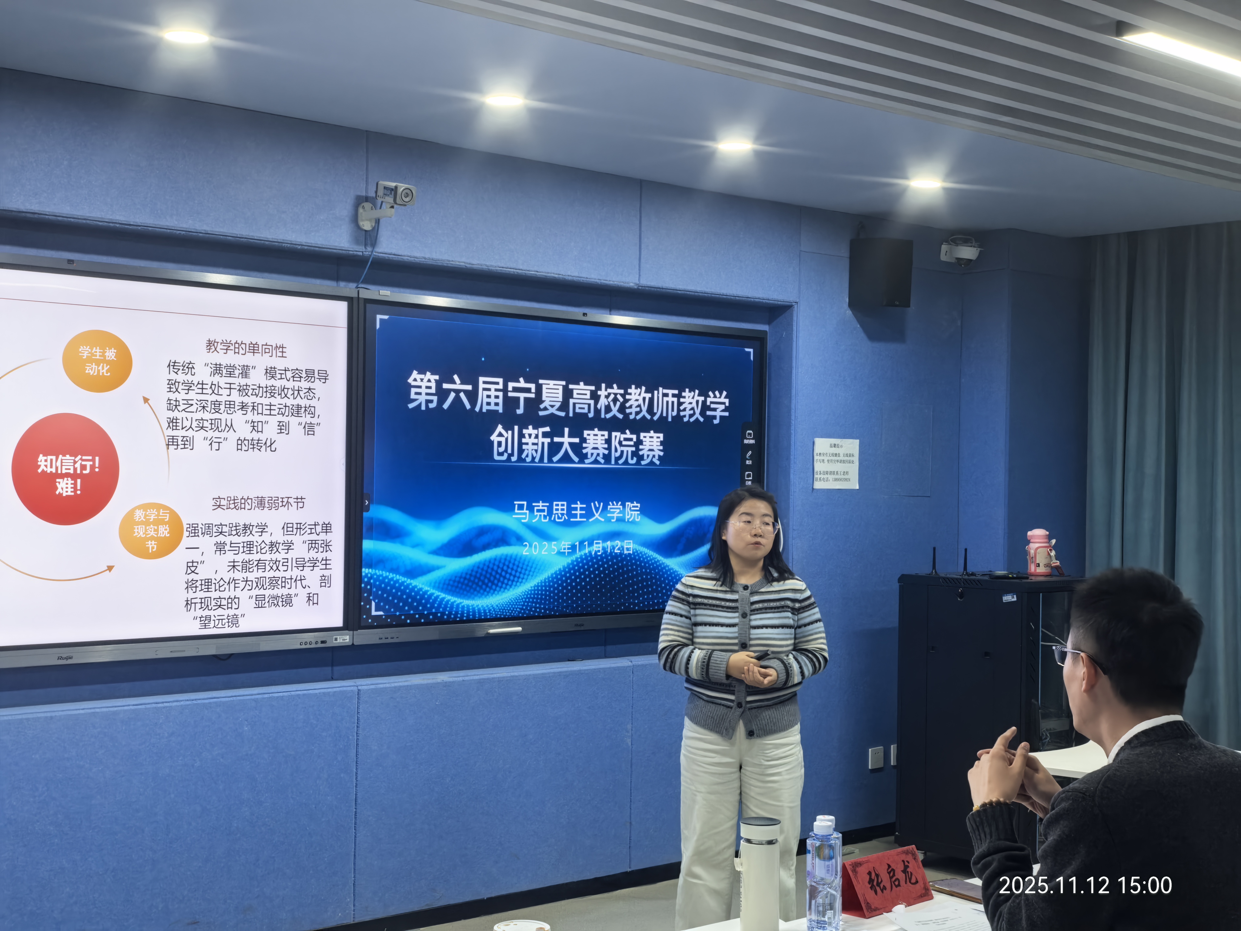 为深入贯彻落实新时代全国高等学校本科教育工作会议精神,扎实推进“立德树人”根本任务落地见效,持续提升思政教师的教学创新能力与育人水平,11月12日下午,马克思主义学院精心举办第六届宁夏高校教师教学创新大赛院赛。学院副院长黄炎主持赛事,特邀校外高校教学专家成三人评委团,来自学院各教研室的6位教师同台竞技,展现思政教学的创新活力与育人温度。