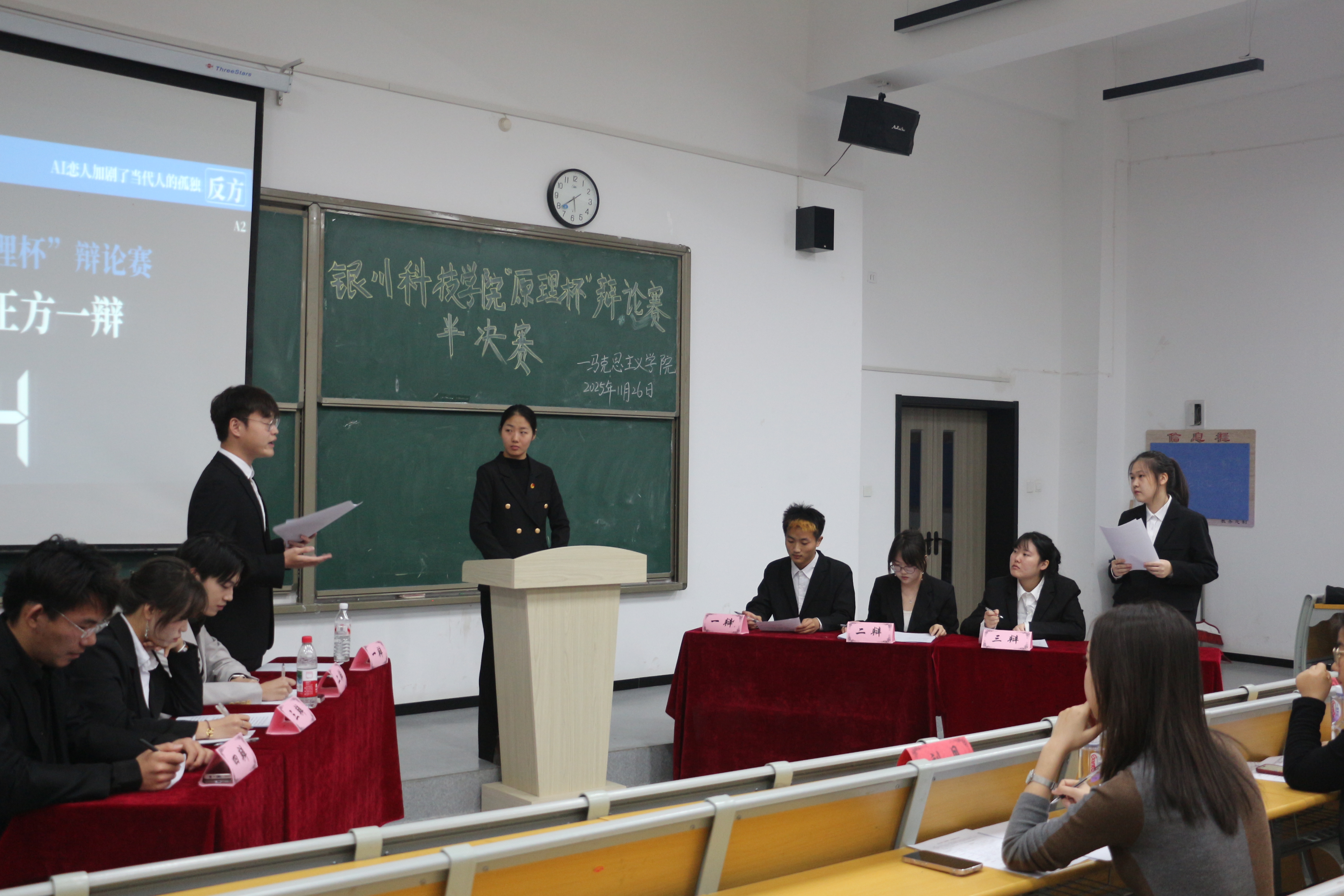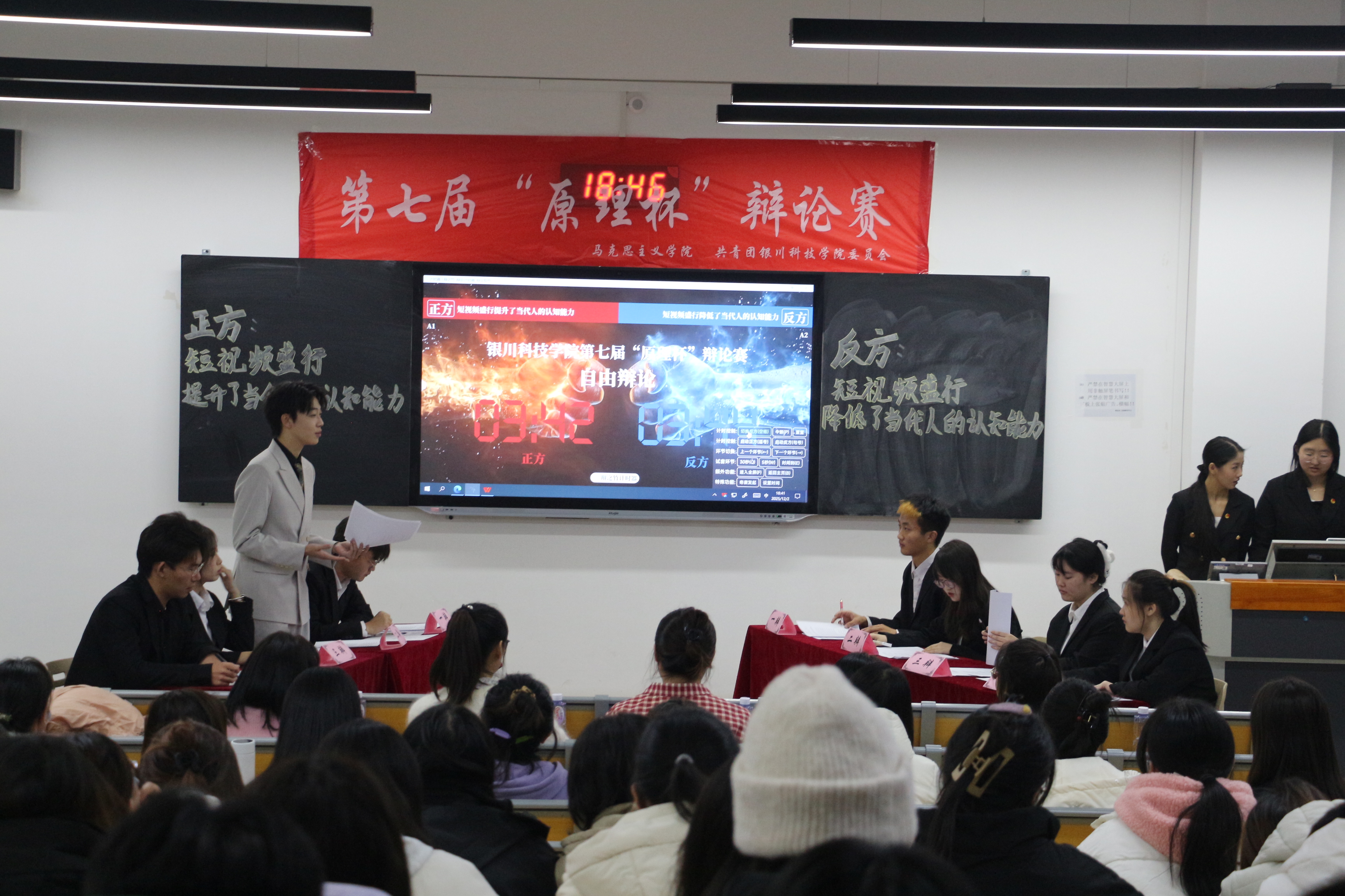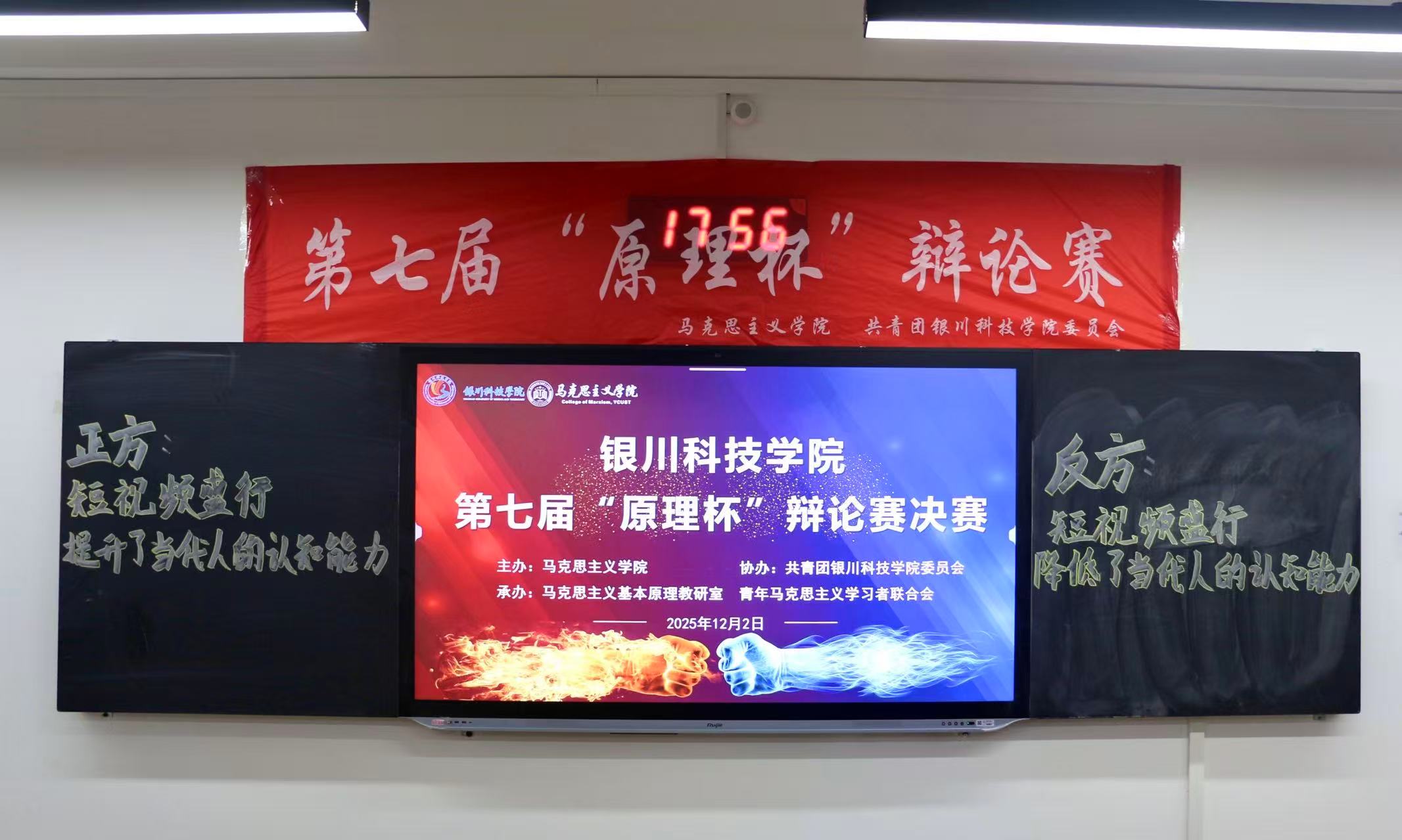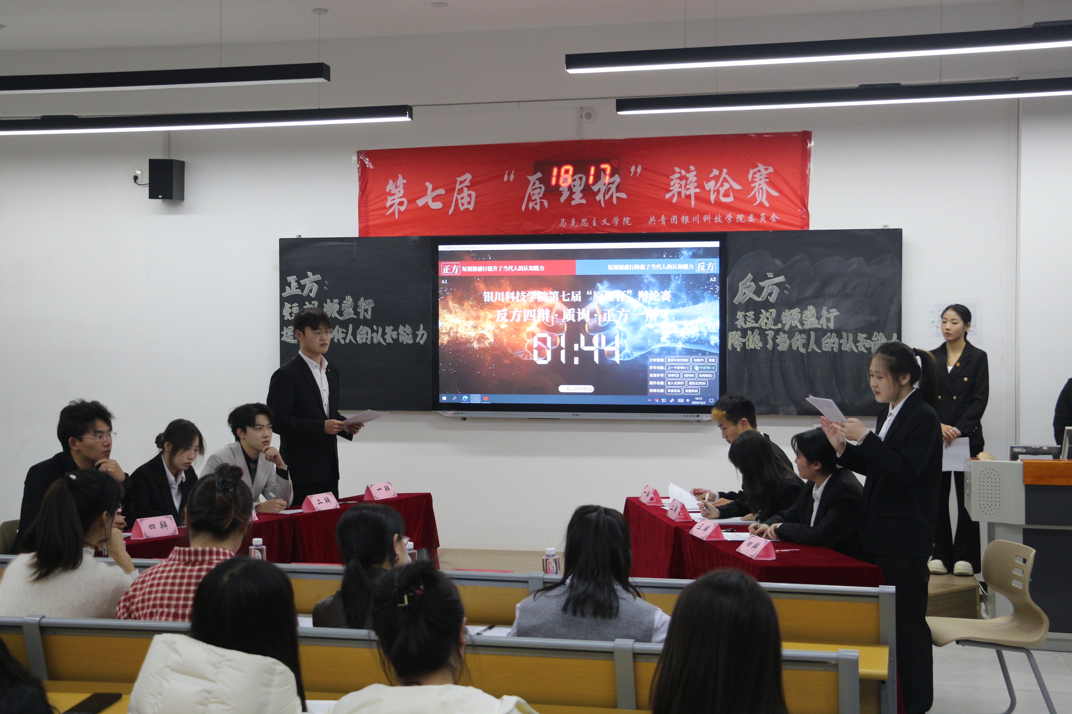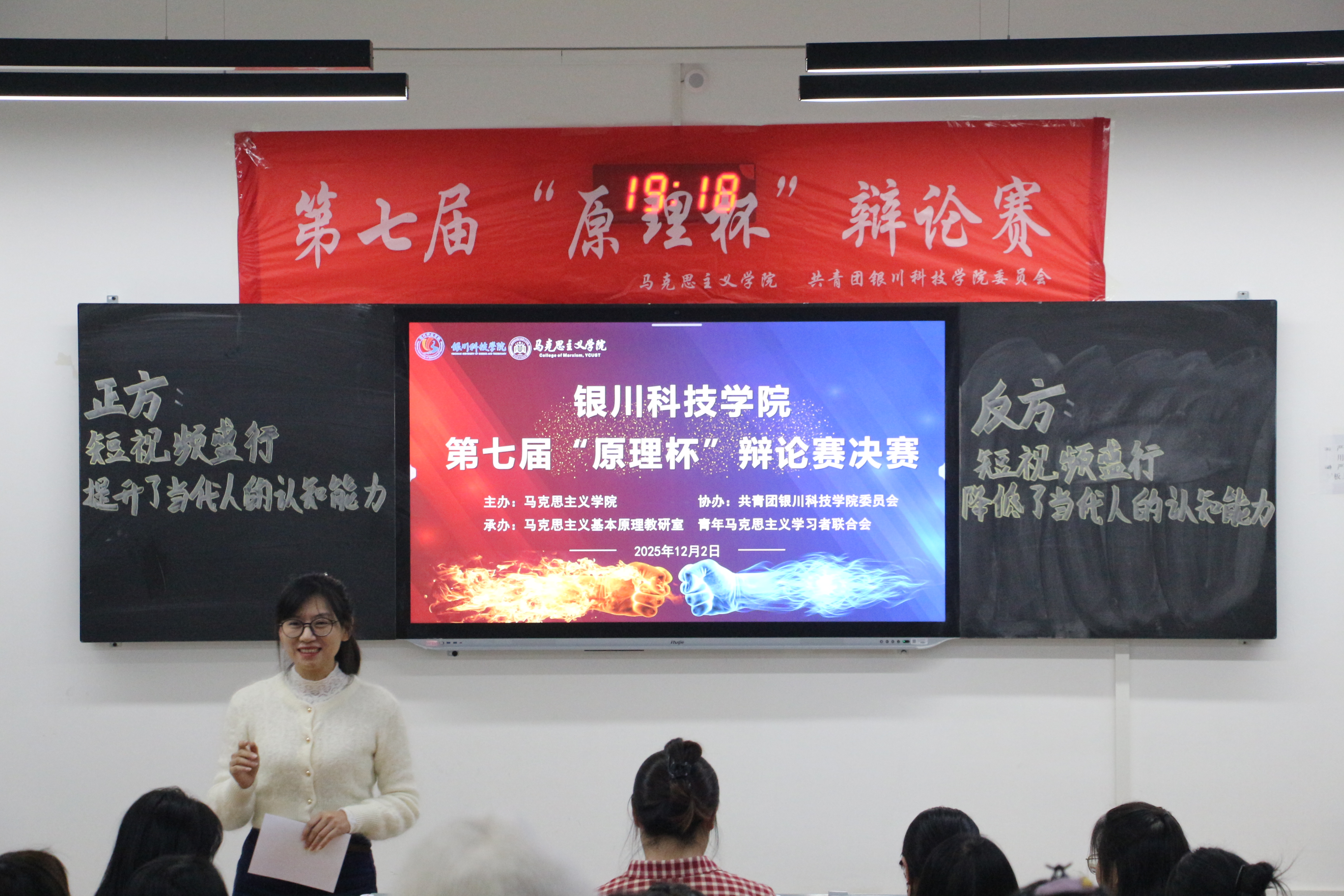 2025年12月2日,银川科技学院第七届“原理杯”辩论赛在A9-211阶梯教室圆满收官。“原理杯”辩论赛是马克思主义基本原理教研室打造的思政实践品牌活动,也是马克思主义学院深化“大思政课”育人体系的重要实践平台,本届赛事以“以辩明思,以论践知”为核心主题,由马克思主义学院主办、共青团银川科技学院委员会协办。自11月15日活动启动以来,吸引2024级32名学子组建8支队伍,历经初赛、复赛、半决赛近半个月的思想淬炼,最终在决赛舞台上呈现了一场理论与实践交融、思辨与成长共生的思政育人实践课。150余名师生代表现场参与,共同见证这场青春与真理的精彩碰撞,感受马克思主义理论在“大思政”格局下的鲜活力量。