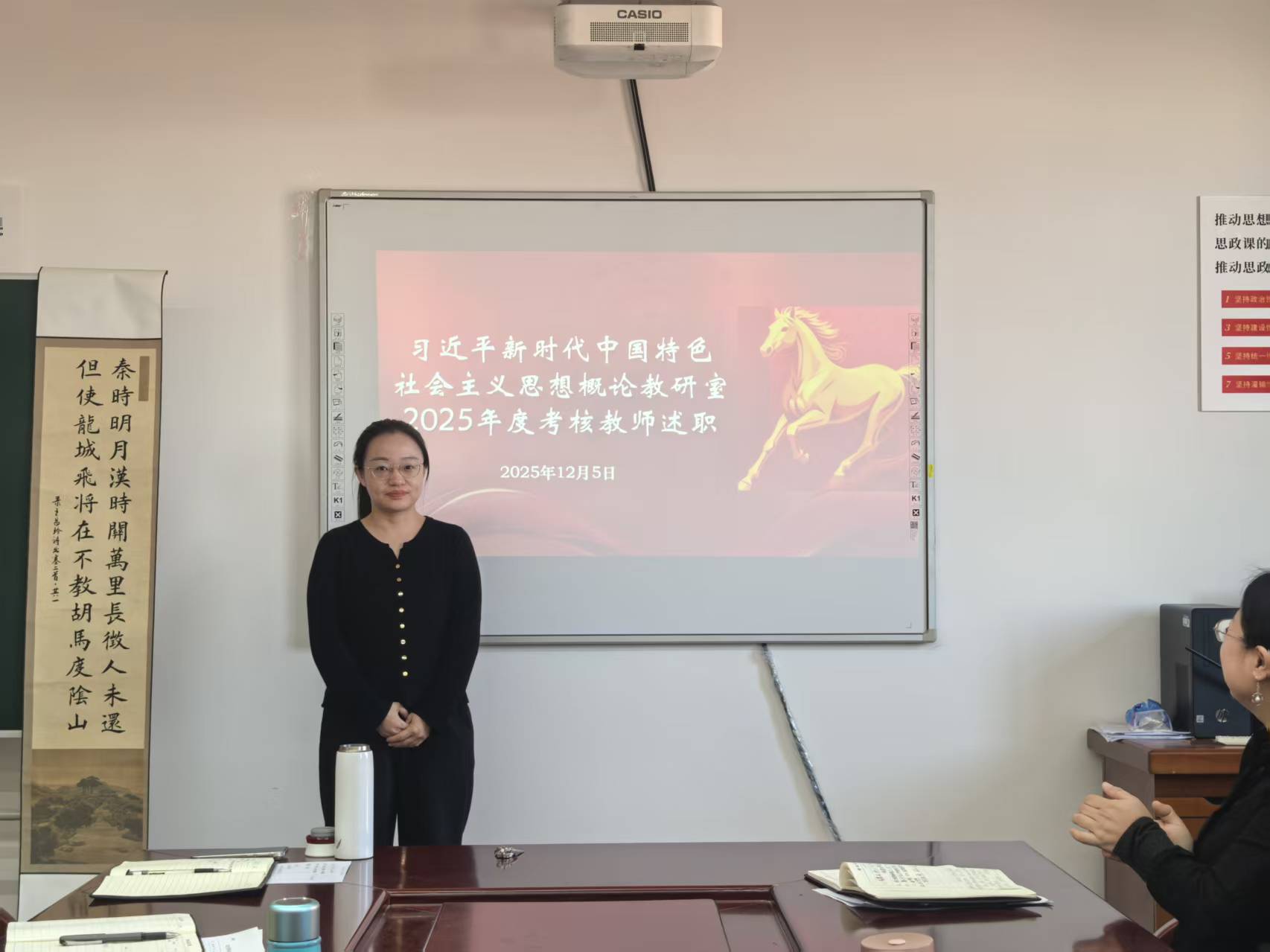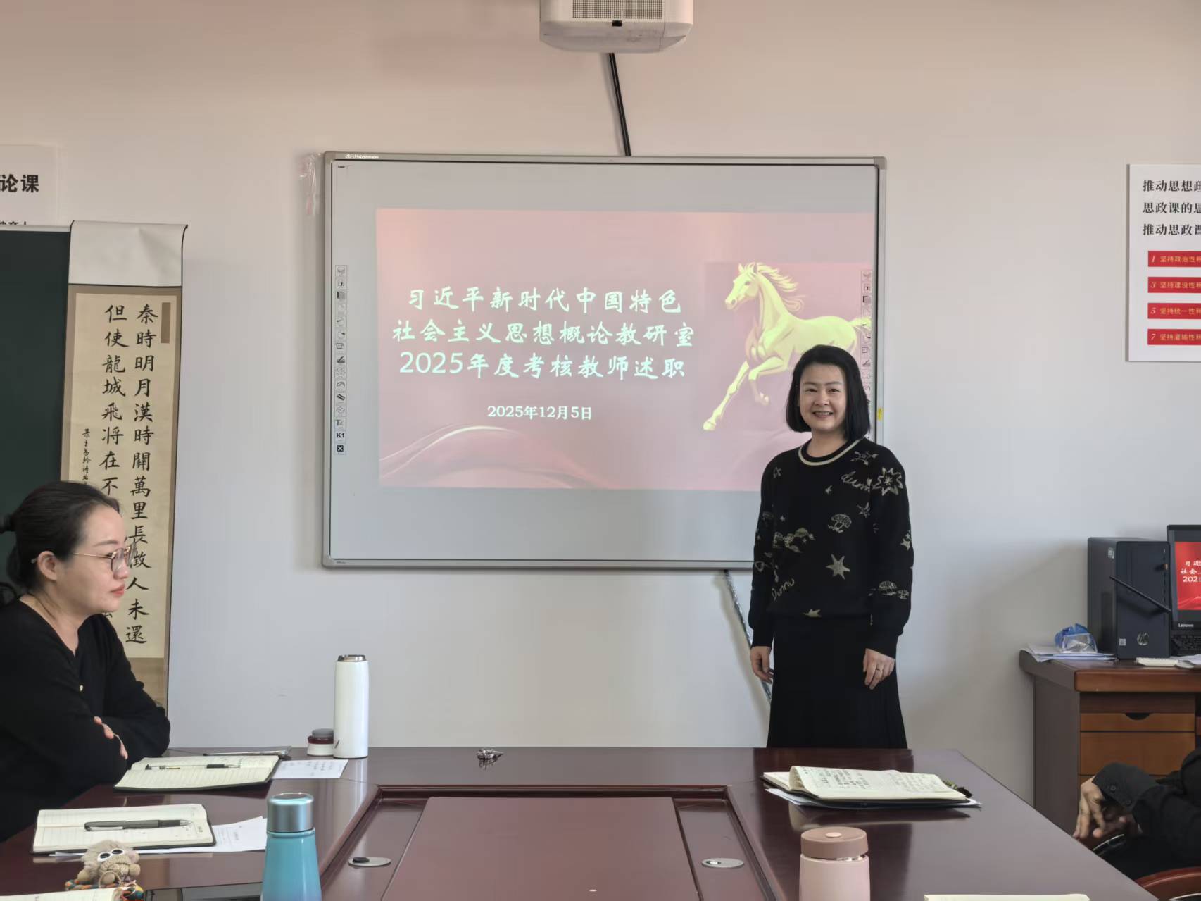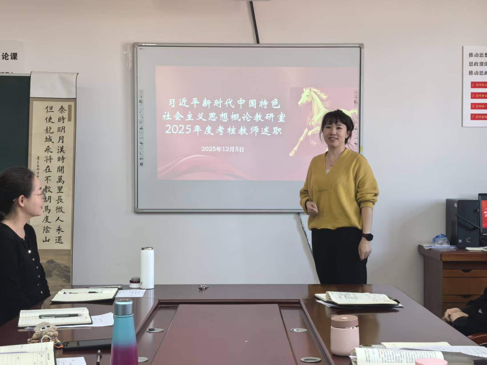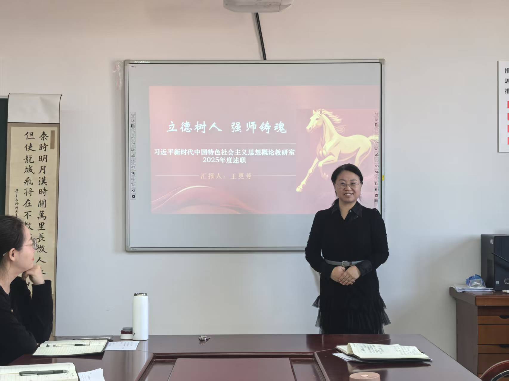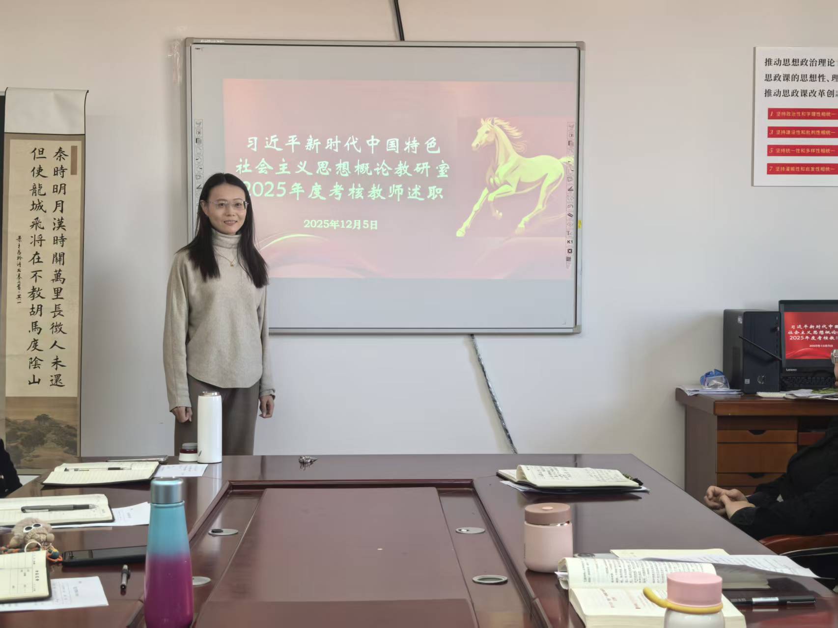 为全面总结回顾2025年度工作,进一步加强师资队伍建设,提升教育教学质量,根据学校、学院相关工作安排,习近平新时代中国特色社会主义思想概论教研室于12月5日在A1-506召开教研室年度考核教师个人工作述职及民主评议会。会议由教研室主任王更芳主持,教研室全体教师参会。