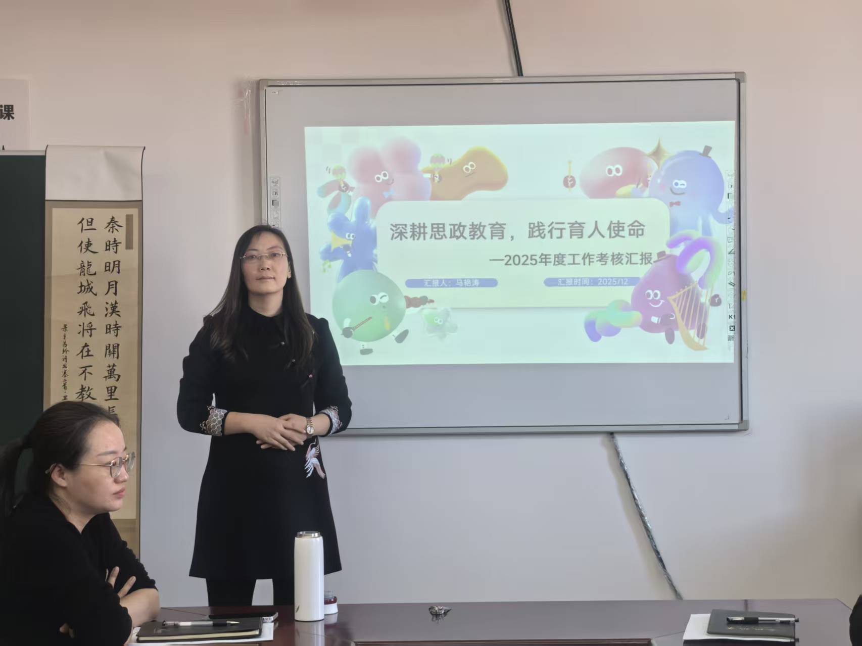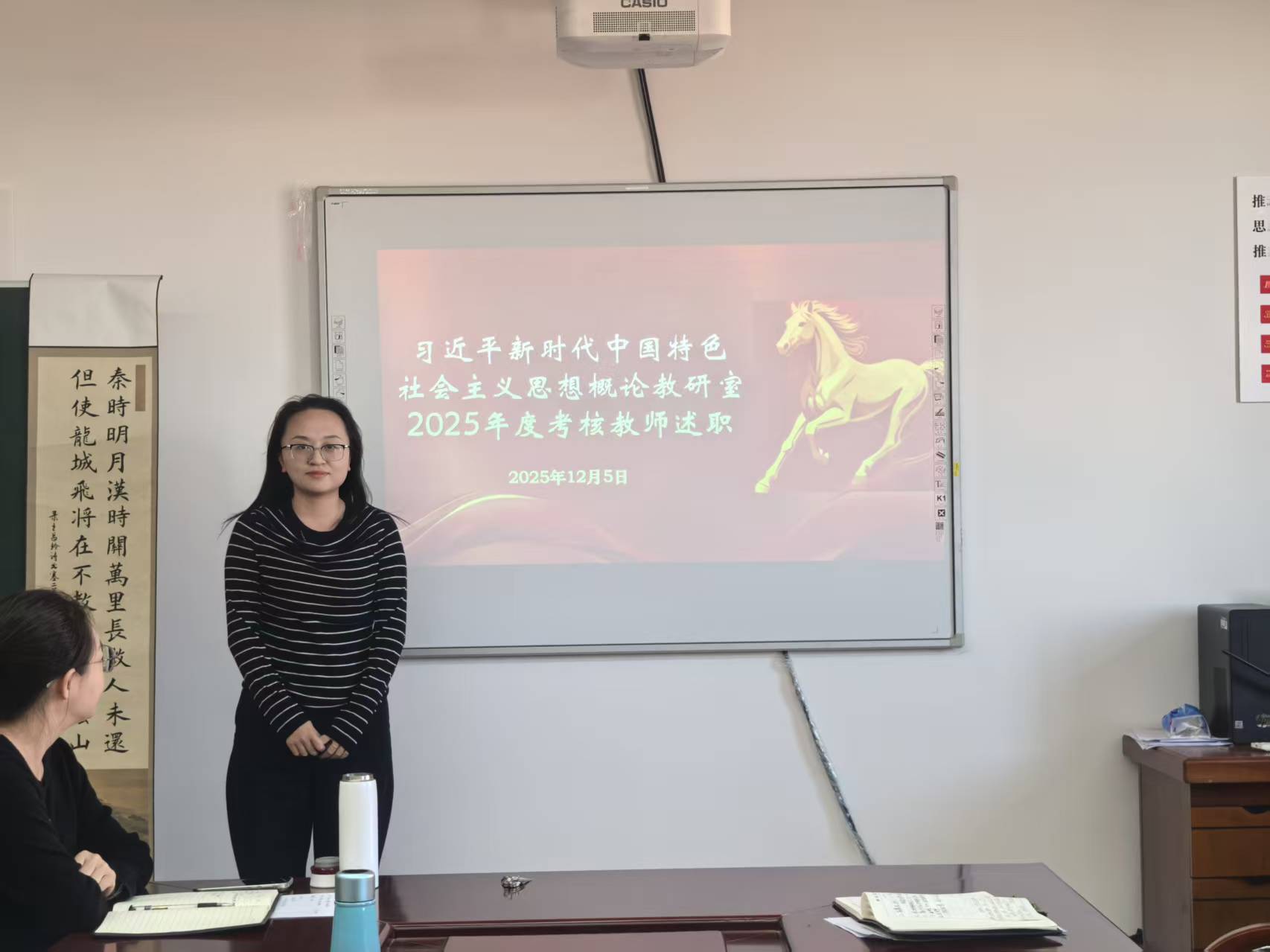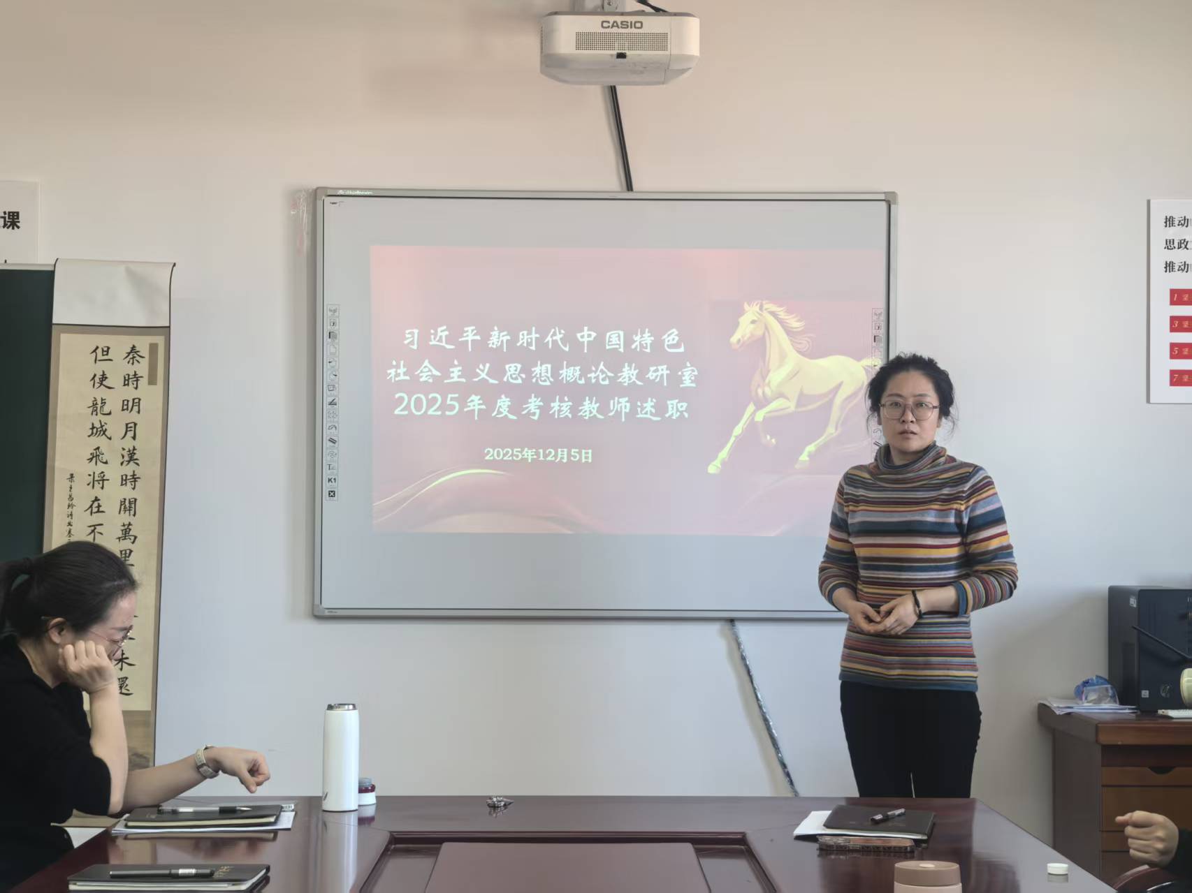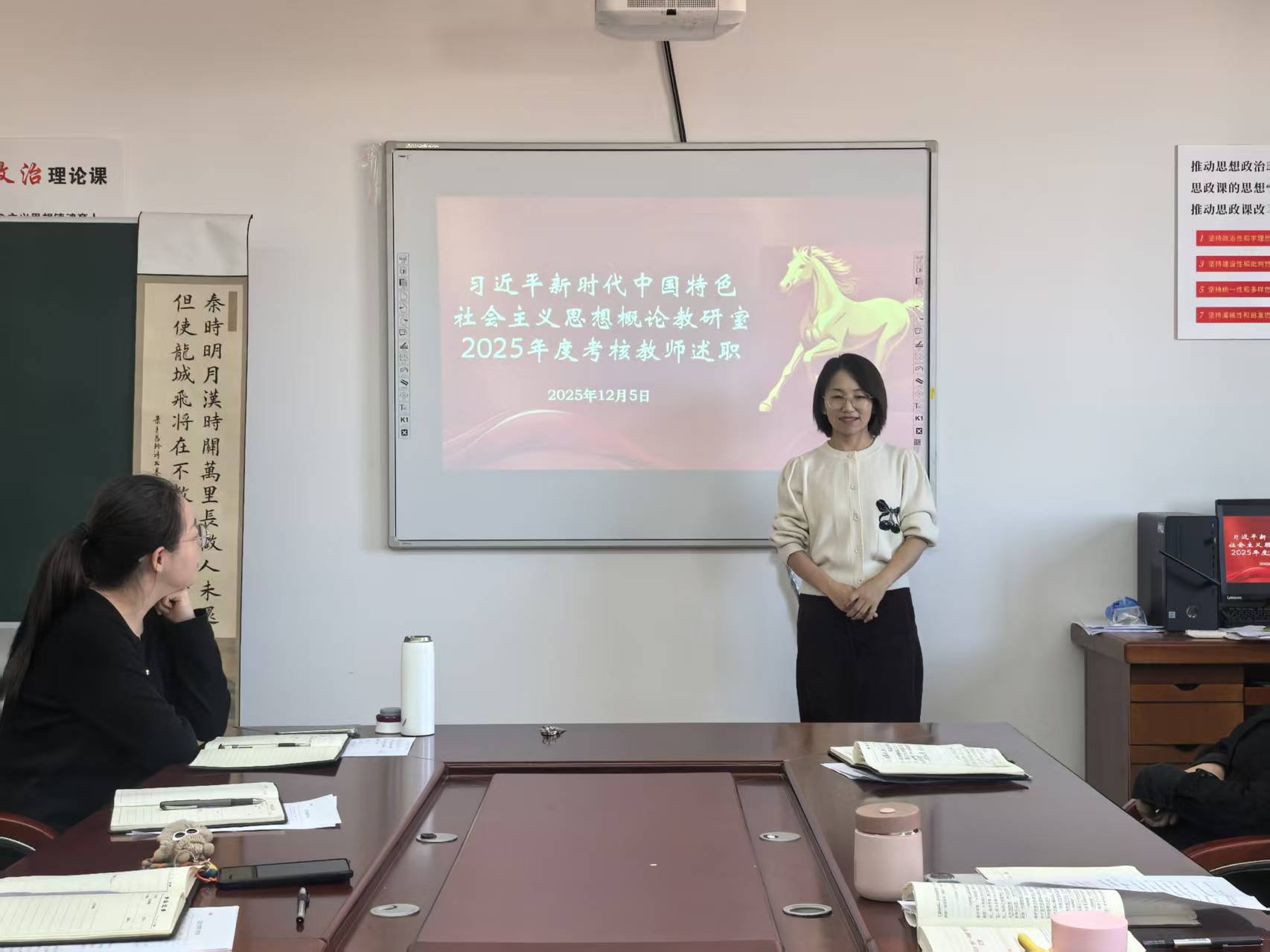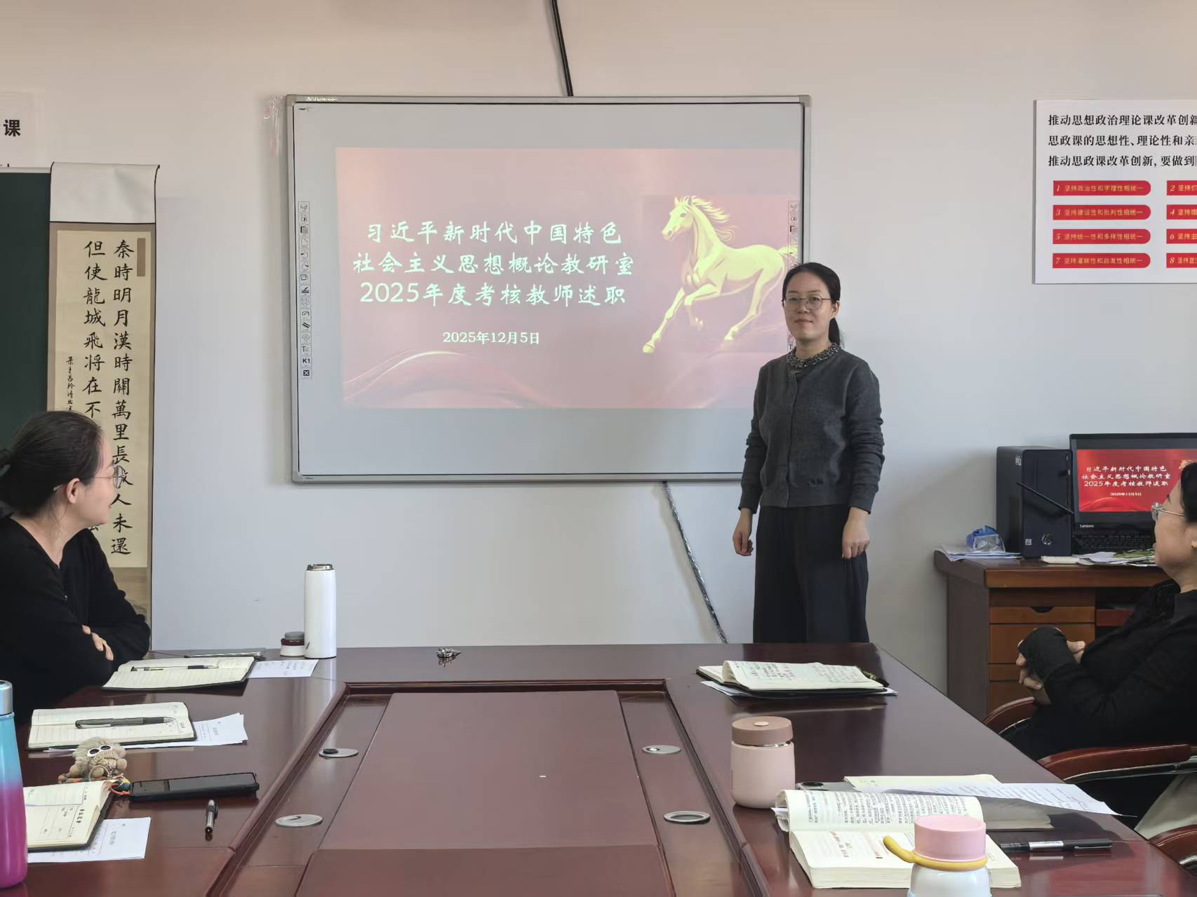为全面总结回顾2025年度工作,进一步加强师资队伍建设,提升教育教学质量,根据学校、学院相关工作安排,习近平新时代中国特色社会主义思想概论教研室于12月5日在A1-506召开教研室年度考核教师个人工作述职及民主评议会。会议由教研室主任王更芳主持,教研室全体教师参会。