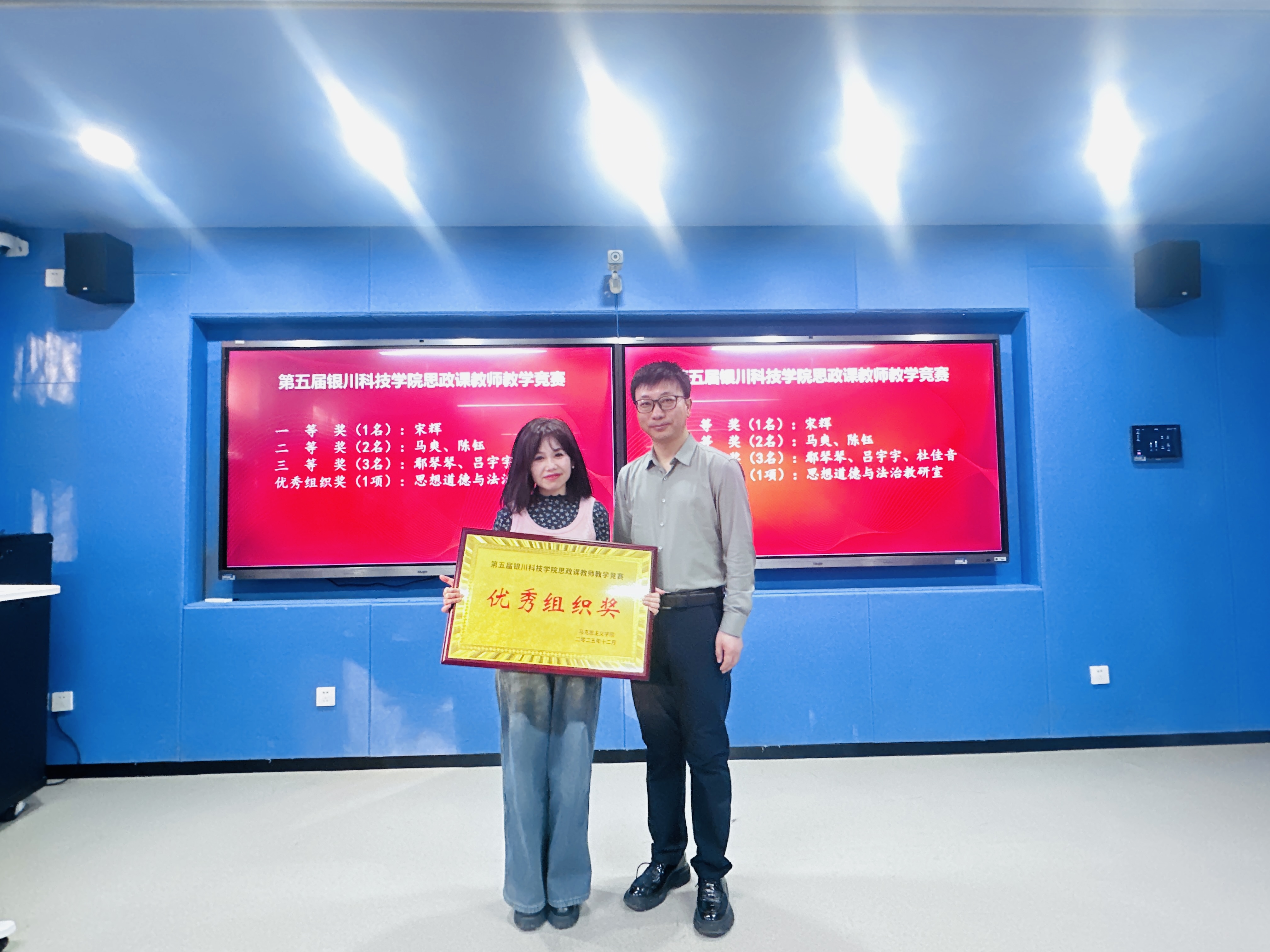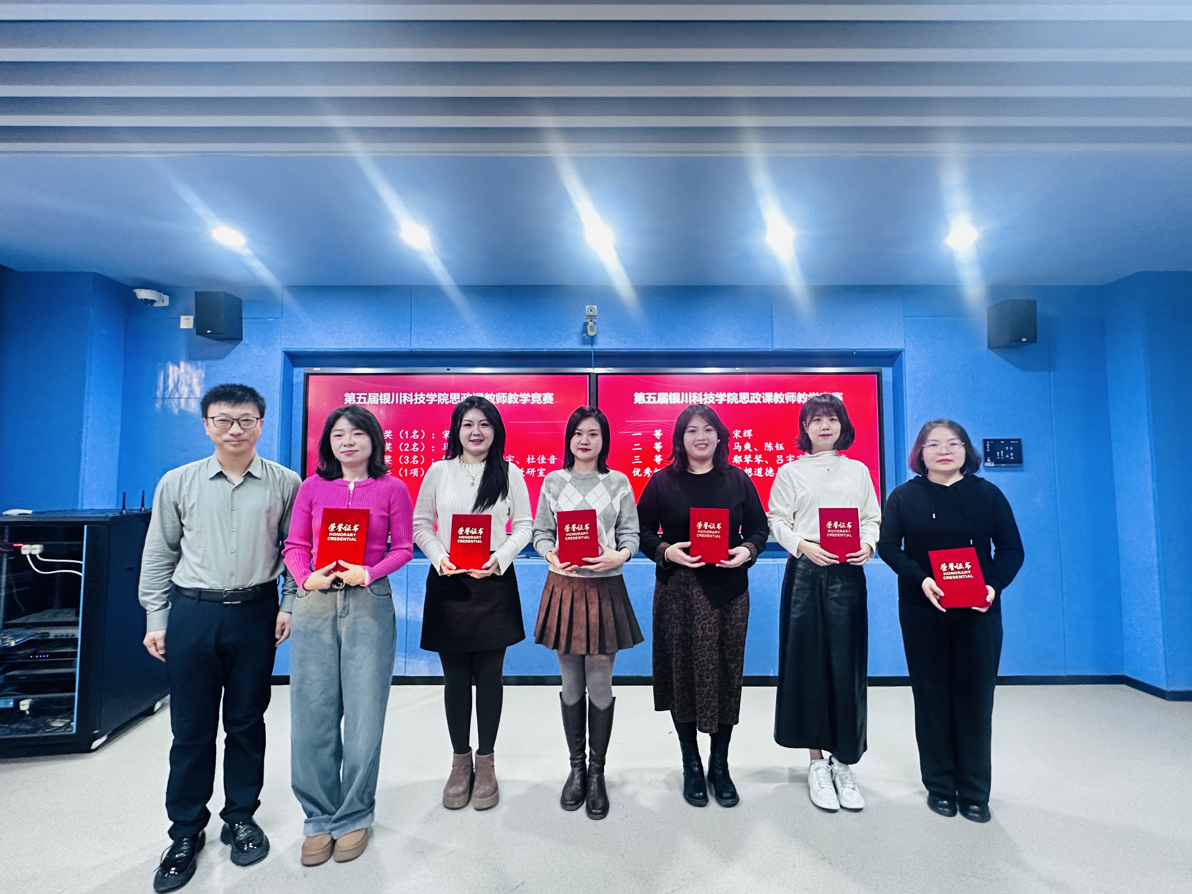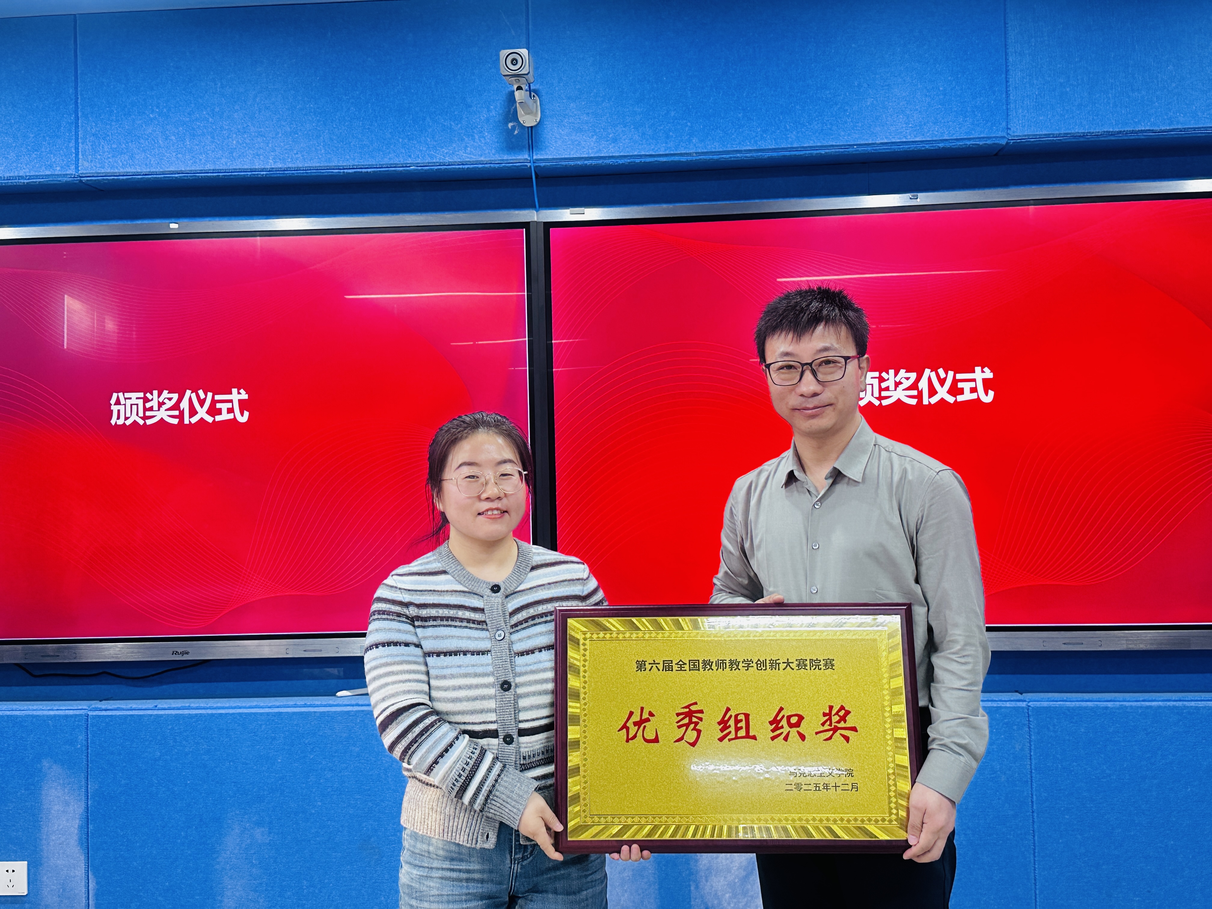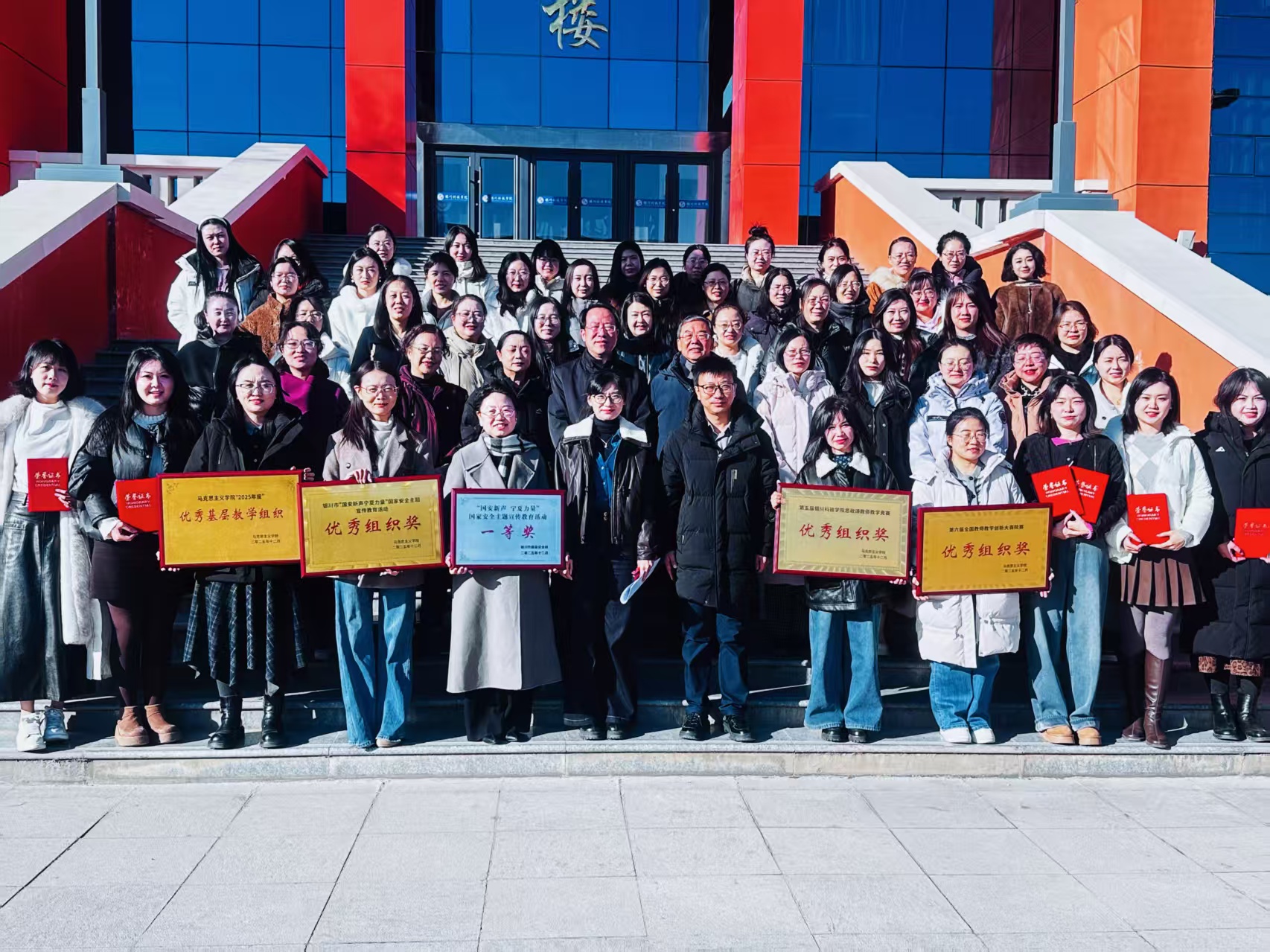 在微课堂精神感召下,伏晓春院长宣读表彰决定,对第六届高校教师教学创新大赛院赛、第五届银川科技学院思政课教师教学竞赛优秀个人,以及2025年度表现突出的优秀基层教学组织、先进个人予以表彰。获奖代表依次登台领奖,现场掌声阵阵。这份表彰既是对耕耘者过往付出的充分肯定,更饱含着学院对深耕思政教育、续写发展新篇的深切期许。